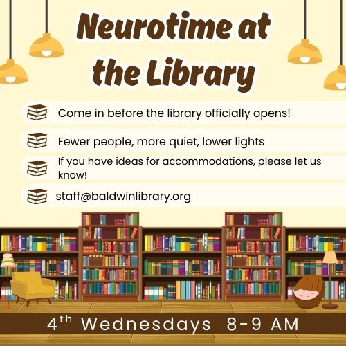 If you have any accommodation ideas that would make your trips to the library more enjoyable, please let us know! staff@baldwinlibrary.org